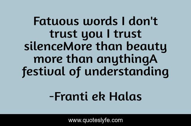 This page presents the quote "Fatuous words I don't trust you I trust silenceMore than beauty more than anythingA festival of understanding". Author of this quote is František Halas. This quote is about trust, silence,.