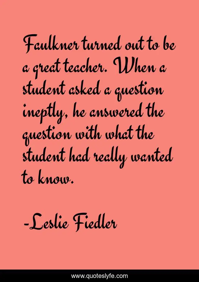 This page presents the quote "Faulkner turned out to be a great teacher. When a student asked a question ineptly, he answered the question with what the student had really wanted to know.". Author of this quote is Leslie Fiedler. This quote is about great, student,.