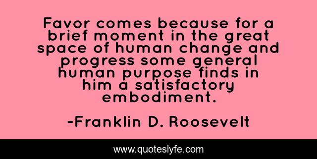 This page presents the quote "Favor comes because for a brief moment in the great space of human change and progress some general human purpose finds in him a satisfactory embodiment.". Author of this quote is Franklin D. Roosevelt. This quote is about progress, great, change,.