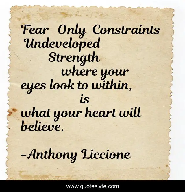 This page presents the quote "Fear Only Constraints Undeveloped Strength where your eyes look to within, is what your heart will believe.". Author of this quote is Anthony Liccione. This quote is about heart, eyes, strength, focus, fear, believe,.