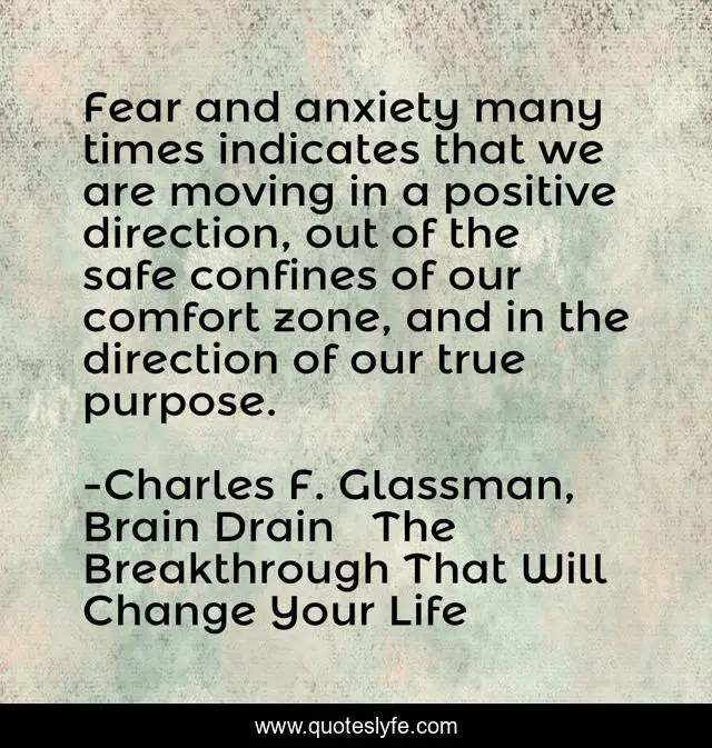 This page presents the quote "Fear and anxiety many times indicates that we are moving in a positive direction, out of the safe confines of our comfort zone, and in the direction of our true purpose.". Author of this quote is Charles F. Glassman, Brain Drain The Breakthrough That Will Change Your Life. This quote is about anxiety, personal-growth, wisdom, fear-of-unknown, inspirational, comfort-zone, enthusiasm, fear, successful-living,.