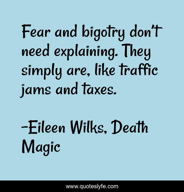 This page presents the quote "Fear and bigotry don’t need explaining. They simply are, like traffic jams and taxes.". Author of this quote is Eileen Wilks, Death Magic. This quote is about lupi, bigotry, paranormal, taxes, eileen-wilks, death-magic, fear,.