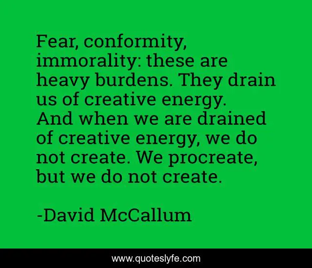 This page presents the quote "Fear, conformity, immorality: these are heavy burdens. They drain us of creative energy. And when we are drained of creative energy, we do not create. We procreate, but we do not create.". Author of this quote is David McCallum. This quote is about energy, conformity, creative,.