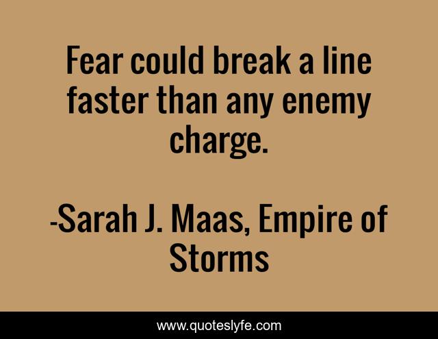 This page presents the quote "Fear could break a line faster than any enemy charge.". Author of this quote is Sarah J. Maas, Empire of Storms. This quote is about strength, empire-of-storms, fight, amry, fear, war,.
