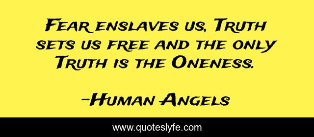 This page presents the quote "Fear enslaves us, Truth sets us free and the only Truth is the Oneness.". Author of this quote is Human Angels. This quote is about angel, fears, oneness, truth, fear, angels,.