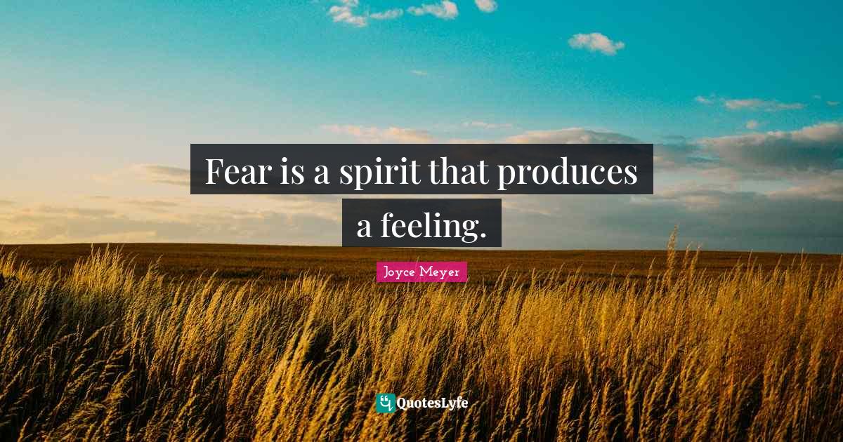 This page presents the quote "Fear is a spirit that produces a feeling.". Author of this quote is Joyce Meyer. This quote is about spirit, fear, produce, feelings,.