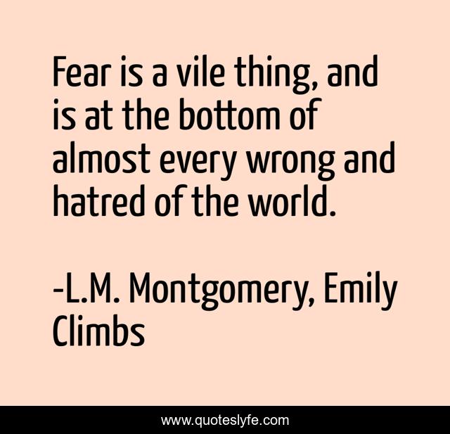 This page presents the quote "Fear is a vile thing, and is at the bottom of almost every wrong and hatred of the world.". Author of this quote is L.M. Montgomery, Emily Climbs. This quote is about fear, cause, evil, vile,.