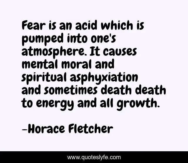This page presents the quote "Fear is an acid which is pumped into one's atmosphere. It causes mental moral and spiritual asphyxiation and sometimes death death to energy and all growth.". Author of this quote is Horace Fletcher. .