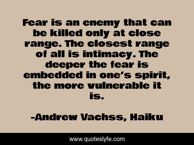 This page presents the quote "Fear is an enemy that can be killed only at close range. The closest range of all is intimacy. The deeper the fear is embedded in one’s spirit, the more vulnerable it is.". Author of this quote is Andrew Vachss, Haiku. .