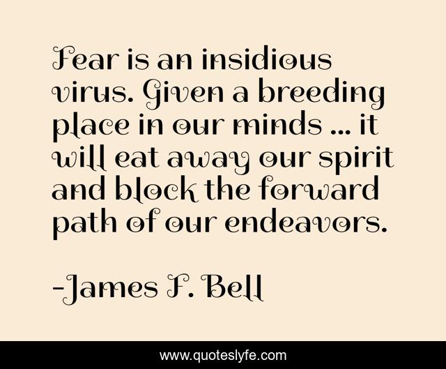 This page presents the quote "Fear is an insidious virus. Given a breeding place in our minds ... it will eat away our spirit and block the forward path of our endeavors.". Author of this quote is James F. Bell. .