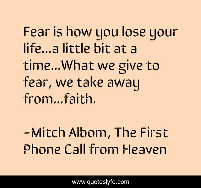 "Mitch Albom, The First Phone Call from Heaven Quotes." Quoteslyfe.com, 2025. Mon. 08 Dec. 2025. <https://www.quoteslyfe.com/quote/Fear-is-how-you-lose-your-life-5053>.