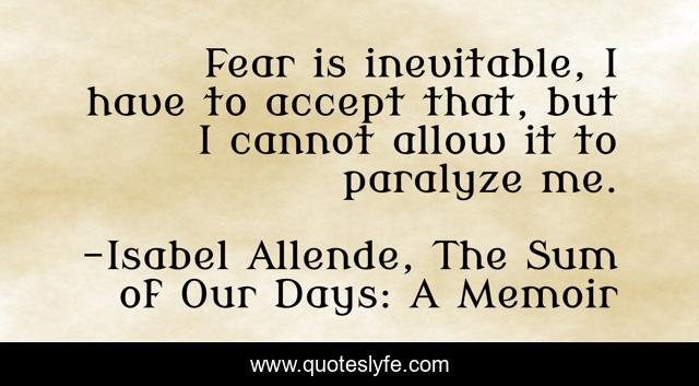 This page presents the quote "Fear is inevitable, I have to accept that, but I cannot allow it to paralyze me.". Author of this quote is Isabel Allende, The Sum of Our Days: A Memoir. This quote is about fear, inspiration,.