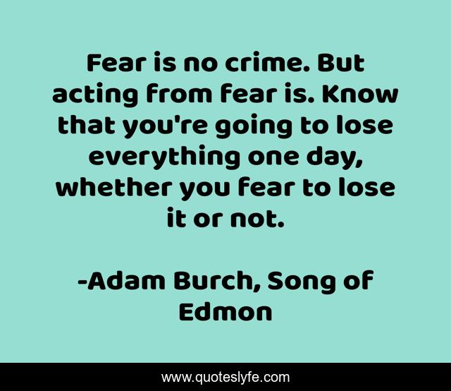 This page presents the quote "Fear is no crime. But acting from fear is. Know that you're going to lose everything one day, whether you fear to lose it or not.". Author of this quote is Adam Burch, Song of Edmon. This quote is about losing, fear,.