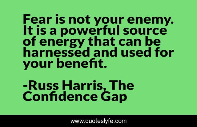 This page presents the quote "Fear is not your enemy. It is a powerful source of energy that can be harnessed and used for your benefit.". Author of this quote is Russ Harris, The Confidence Gap. This quote is about source, benefit, energy, fear, enemy,.