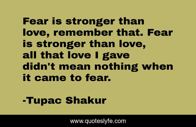 This page presents the quote "Fear is stronger than love, remember that. Fear is stronger than love, all that love I gave didn't mean nothing when it came to fear.". Author of this quote is Tupac Shakur. This quote is about fear, love, tupac, affection,.