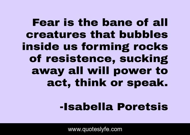 This page presents the quote "Fear is the bane of all creatures that bubbles inside us forming rocks of resistence, sucking away all will power to act, think or speak.". Author of this quote is Isabella Poretsis. This quote is about resistence, fear, darkness, racism,.