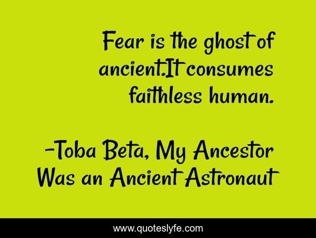 This page presents the quote "Fear is the ghost of ancient.It consumes faithless human.". Author of this quote is Toba Beta, My Ancestor Was an Ancient Astronaut. This quote is about ghost, faith, fear, ancient,.