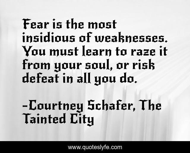 This page presents the quote "Fear is the most insidious of weaknesses. You must learn to raze it from your soul, or risk defeat in all you do.". Author of this quote is Courtney Schafer, The Tainted City. This quote is about inspriational, fear, courage, victory,.