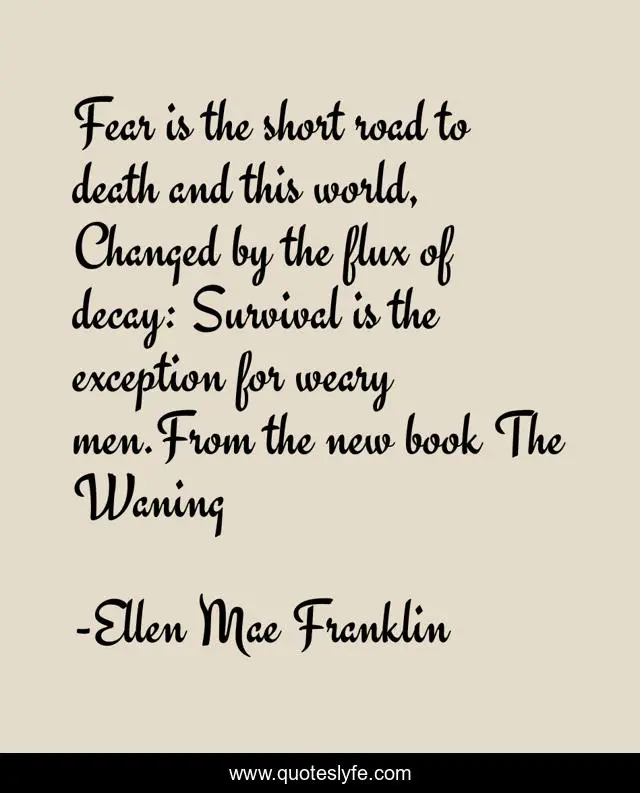 This page presents the quote "Fear is the short road to death and this world, Changed by the flux of decay: Survival is the exception for weary men.From the new book The Waning". Author of this quote is Ellen Mae Franklin. This quote is about apocalyptic, city, death, undead, waning, horror, zombie, fantasy, ellenmaefranklin,.