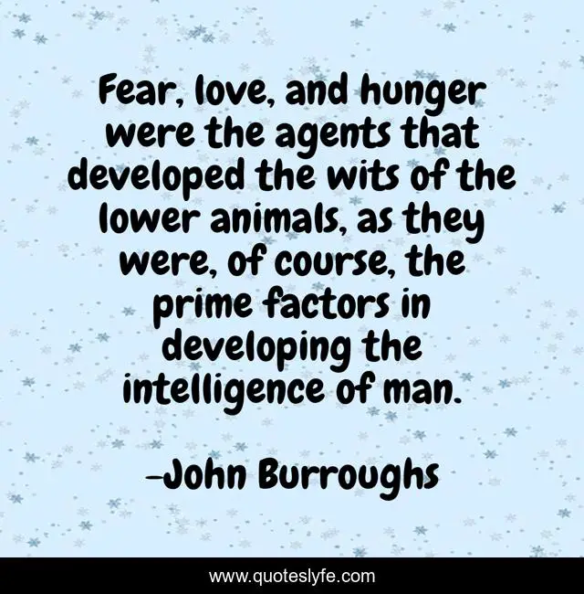 This page presents the quote "Fear, love, and hunger were the agents that developed the wits of the lower animals, as they were, of course, the prime factors in developing the intelligence of man.". Author of this quote is John Burroughs. This quote is about fear, love, affection, man,.