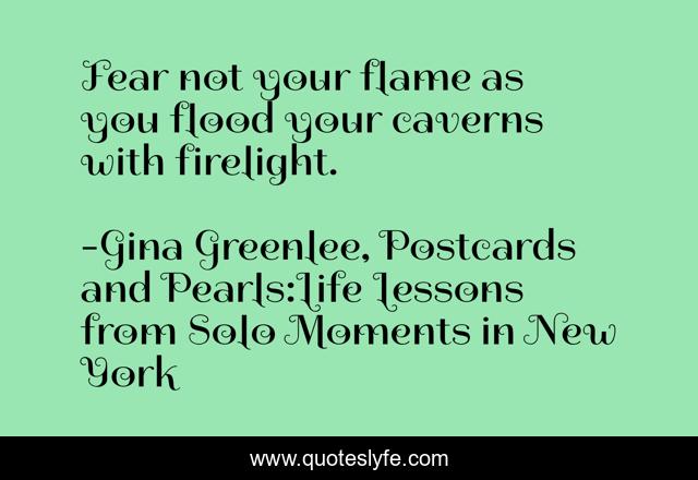 This page presents the quote "Fear not your flame as you flood your caverns with firelight.". Author of this quote is Gina Greenlee, Postcards and Pearls:Life Lessons from Solo Moments in New York. This quote is about travel, new-york-city, new-york-travel, travel-writing, traveling,.