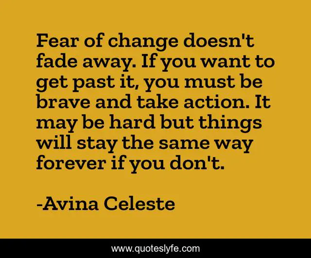 This page presents the quote "Fear of change doesn't fade away. If you want to get past it, you must be brave and take action. It may be hard but things will stay the same way forever if you don't.". Author of this quote is Avina Celeste. This quote is about confidence, brave, positive, motivational, optimistic, inspirational, action, enthusiasm, fear,.