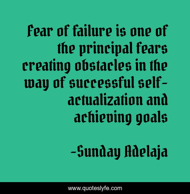 This page presents the quote "Fear of failure is one of the principal fears creating obstacles in the way of successful self-actualization and achieving goals". Author of this quote is Sunday Adelaja. This quote is about life, goal, actualization, obstacles, fears, mission, calling, failure, purpose,.