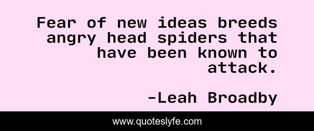 This page presents the quote "Fear of new ideas breeds angry head spiders that have been known to attack.". Author of this quote is Leah Broadby. This quote is about funny, humour, children-s-books, philosophy, fantasy, comedy,.