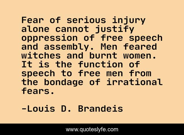 This page presents the quote "Fear of serious injury alone cannot justify oppression of free speech and assembly. Men feared witches and burnt women. It is the function of speech to free men from the bondage of irrational fears.". Author of this quote is Louis D. Brandeis. This quote is about alone, fear, history,.