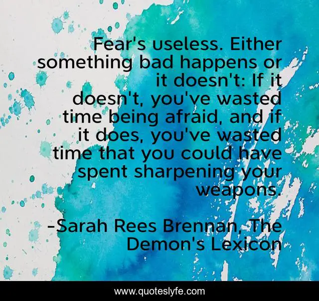 This page presents the quote "Fear's useless. Either something bad happens or it doesn't: If it doesn't, you've wasted time being afraid, and if it does, you've wasted time that you could have spent sharpening your weapons.". Author of this quote is Sarah Rees Brennan, The Demon's Lexicon. This quote is about fear, life-lessons,.
