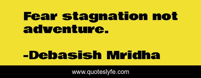 This page presents the quote "Fear stagnation not adventure.". Author of this quote is Debasish Mridha. This quote is about stagnation, philosophy, debasish-mridha, quotes, adventure, inspirational, enthusiasm, fear, fear-stagnation,.