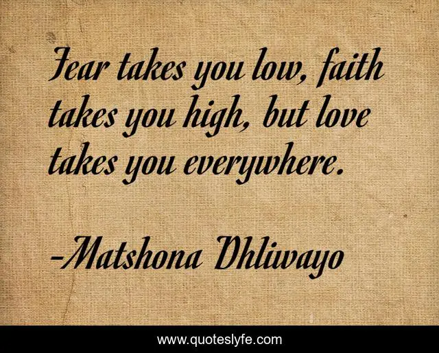 "Matshona Dhliwayo Quotes." Quoteslyfe.com, 2025. Sat. 06 Dec. 2025. <https://www.quoteslyfe.com/quote/Fear-takes-you-low-faith-takes-you-14807>.