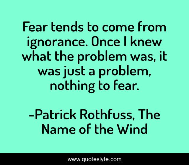 This page presents the quote "Fear tends to come from ignorance. Once I knew what the problem was, it was just a problem, nothing to fear.". Author of this quote is Patrick Rothfuss, The Name of the Wind. This quote is about enthusiasm, inspirational,.