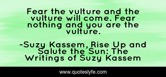 This page presents the quote "Fear the vulture and the vulture will come. Fear nothing and you are the vulture.". Author of this quote is Suzy Kassem, Rise Up and Salute the Sun: The Writings of Suzy Kassem. This quote is about quotes, confidence, suzy-kassem, fear, dreams,.