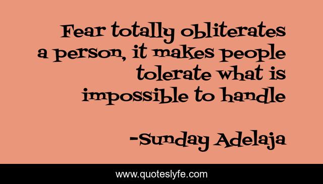 This page presents the quote "Fear totally obliterates a person, it makes people tolerate what is impossible to handle". Author of this quote is Sunday Adelaja. This quote is about handle, people, tolerate, person, impossible, fear, obliterates,.