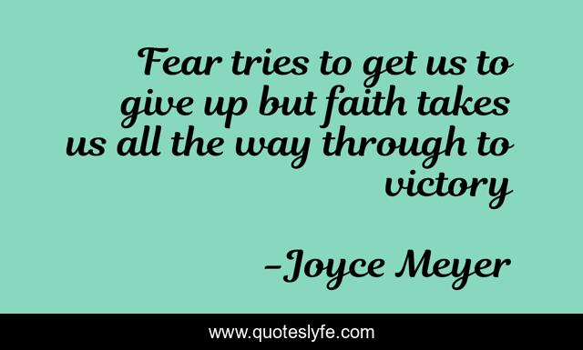This page presents the quote "Fear tries to get us to give up but faith takes us all the way through to victory". Author of this quote is Joyce Meyer. This quote is about faith, fear,.