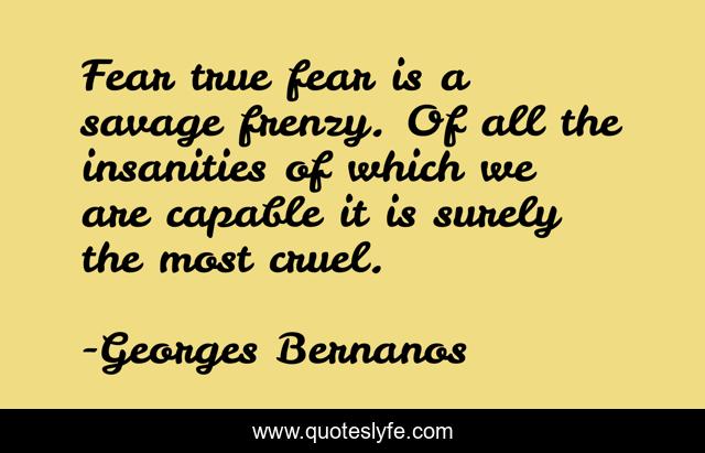 This page presents the quote "Fear true fear is a savage frenzy. Of all the insanities of which we are capable it is surely the most cruel.". Author of this quote is Georges Bernanos. .