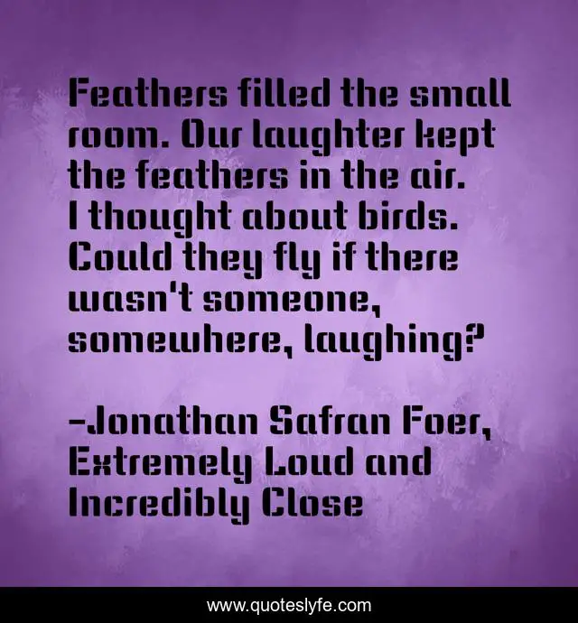 This page presents the quote "Feathers filled the small room. Our laughter kept the feathers in the air. I thought about birds. Could they fly if there wasn't someone, somewhere, laughing?". Author of this quote is Jonathan Safran Foer, Extremely Loud and Incredibly Close. This quote is about philosophy, happiness,.