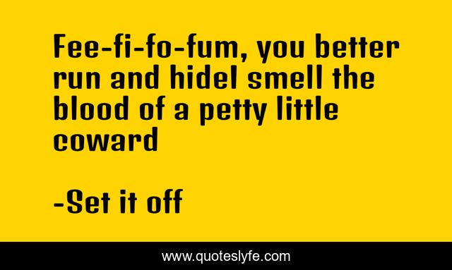 This page presents the quote "Fee-fi-fo-fum, you better run and hideI smell the blood of a petty little coward". Author of this quote is Set it off. This quote is about funny, humor, lyrics, cowards, band, music, comedy,.