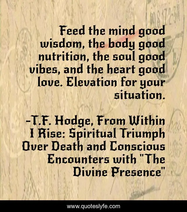 This page presents the quote "Feed the mind good wisdom, the body good nutrition, the soul good vibes, and the heart good love. Elevation for your situation.". Author of this quote is T.F. Hodge, From Within I Rise: Spiritual Triumph Over Death and Conscious Encounters with "The Divine Presence". This quote is about body, confidence, positive, energy, mind, soul, elevate, goodness, uplift,.