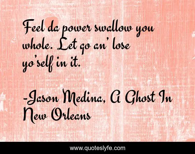 This page presents the quote "Feel da power swallow you whole. Let go an’ lose yo’self in it.". Author of this quote is Jason Medina, A Ghost In New Orleans. This quote is about tribal-publications-inc, power, give-in, advice, a-ghost-in-new-orleans, feel-the-power, let-go, jason-medina, tribal-publications,.