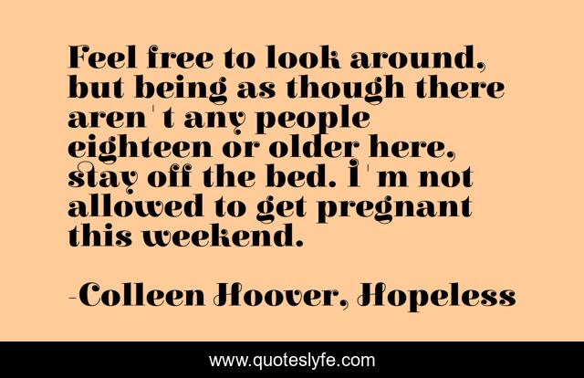 This page presents the quote "Feel free to look around, but being as though there aren't any people eighteen or older here, stay off the bed. I'm not allowed to get pregnant this weekend.". Author of this quote is Colleen Hoover, Hopeless. This quote is about holder, sky, humor, pregnant,.