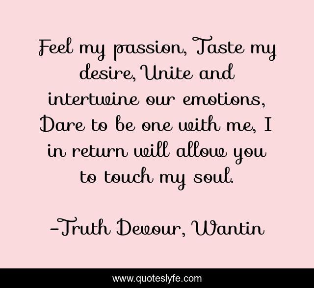 This page presents the quote "Feel my passion, Taste my desire, Unite and intertwine our emotions, Dare to be one with me, I in return will allow you to touch my soul.". Author of this quote is Truth Devour, Wantin. This quote is about desire, love, soul, lust, passion, affection,.
