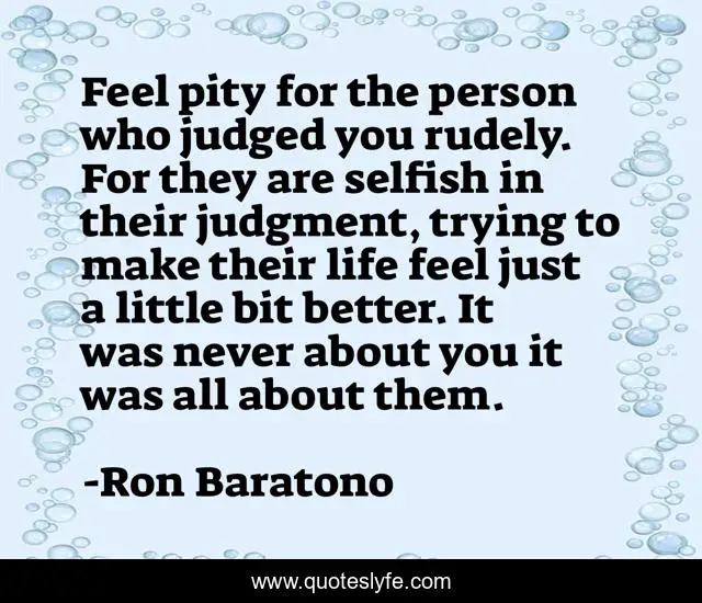 This page presents the quote "Feel pity for the person who judged you rudely. For they are selfish in their judgment, trying to make their life feel just a little bit better. It was never about you it was all about them.". Author of this quote is Ron Baratono. This quote is about judgement, pity, life, people,.