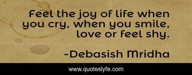 This page presents the quote "Feel the joy of life when you cry, when you smile, love or feel shy.". Author of this quote is Debasish Mridha. This quote is about life, love, knowledge, inspirational, intelligence, philosophy, wisdom, quotes, affection,.