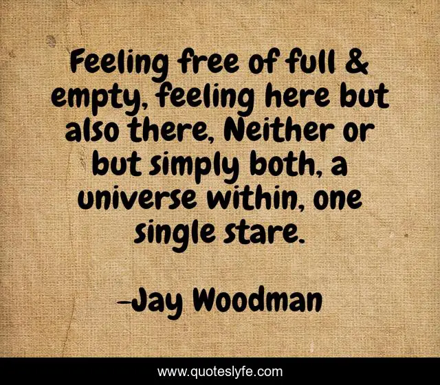 This page presents the quote "Feeling free of full & empty, feeling here but also there, Neither or but simply both, a universe within, one single stare.". Author of this quote is Jay Woodman. This quote is about fun, nonsense, sense,.