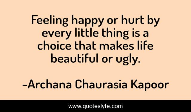 This page presents the quote "Feeling happy or hurt by every little thing is a choice that makes life beautiful or ugly.". Author of this quote is Archana Chaurasia Kapoor. This quote is about happiness-choices, happiness-advice, happiness,.