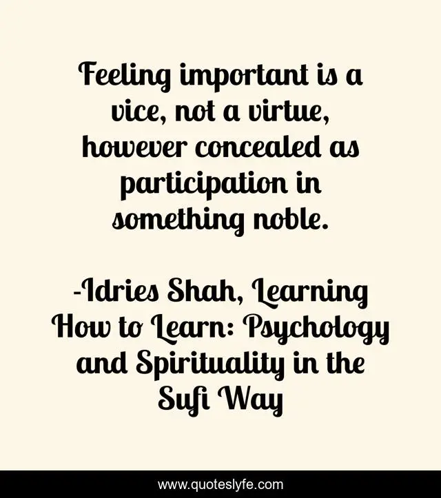 "Idries Shah, Learning How to Learn: Psychology and Spirituality in the Sufi Way Quotes." Quoteslyfe.com, 2025. Fri. 05 Dec. 2025. <https://www.quoteslyfe.com/quote/Feeling-important-is-a-vice-not-a-203498>.
