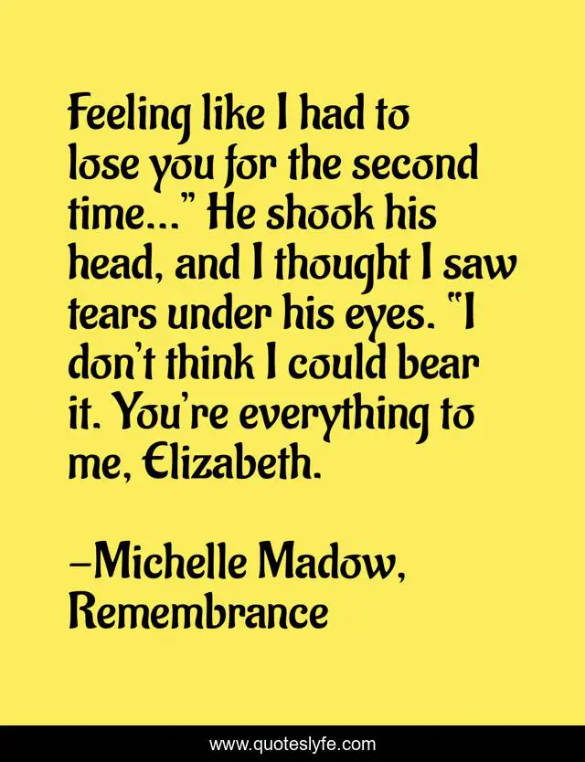 This page presents the quote "Feeling like I had to lose you for the second time...” He shook his head, and I thought I saw tears under his eyes. “I don’t think I could bear it. You’re everything to me, Elizabeth.". Author of this quote is Michelle Madow, Remembrance. This quote is about remembrance, drew-carmichael, love, love-story, affection,.