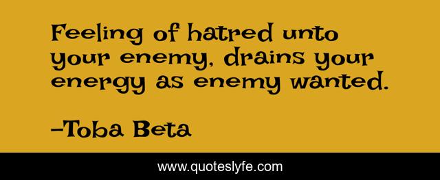 This page presents the quote "Feeling of hatred unto your enemy, drains your energy as enemy wanted.". Author of this quote is Toba Beta. This quote is about enemy, energy, secret, war, ife,.